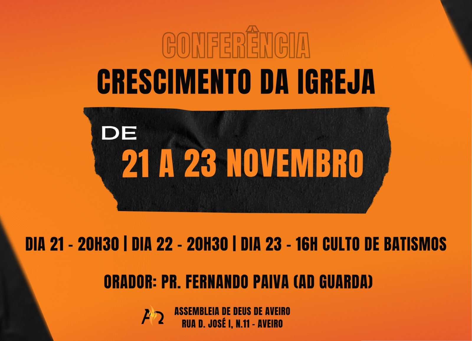 21nov(nov 21)20:2023(nov 23)18:00Conferência Crescimento da Igreja20:20 - 18:00 (23)(GMT+00:00) R. Dom José I 13, 3800-169 Aveiro, Portugal